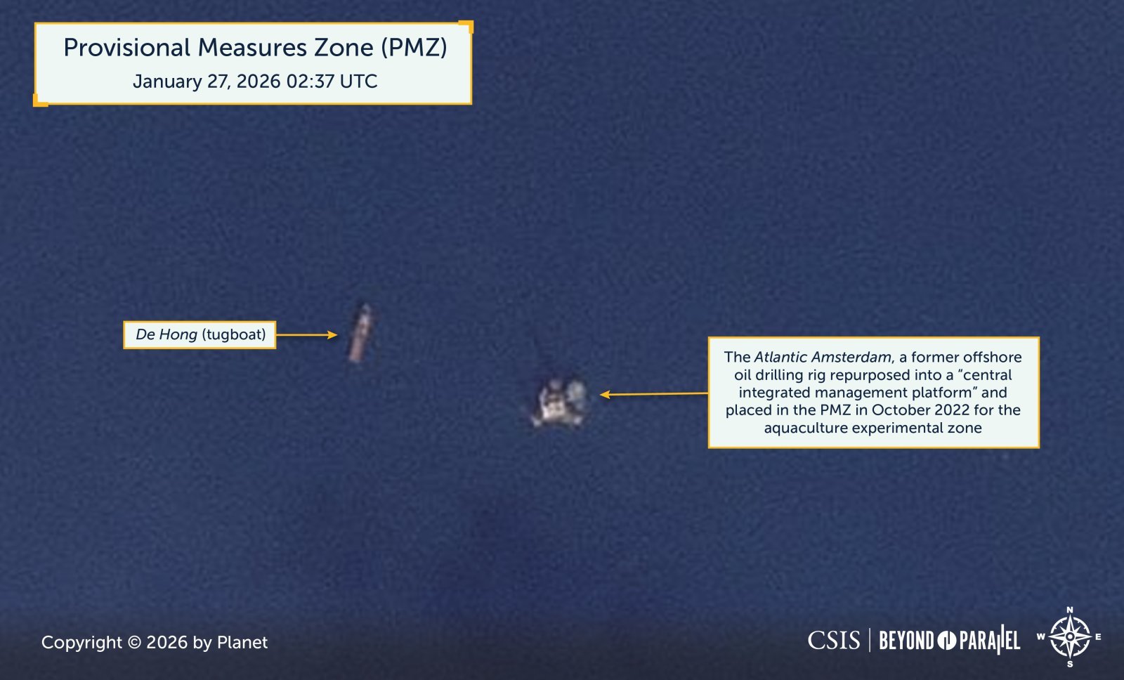CSIS는 이날 공개한 분석 보고서에서 중국이 PMZ 내에 설치했던 관리 플랫폼 ‘애틀랜틱 암스테르담’(Atlantic Amsterdam)이 한국시간 27일 오후 7시 30분께 예인선에 의해 북쪽으로 이동하기 시작했다고 밝혔다.
