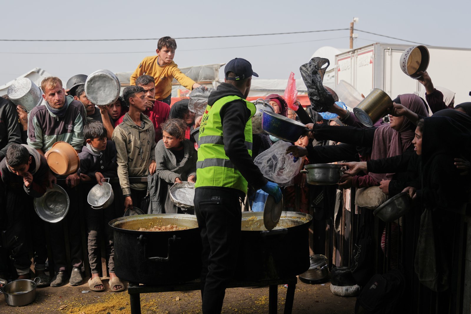23일(현지 시간) 가자지구 남부 칸유니스의 급식소에서 음식을 받으려는 팔레스타인 주민들이 필사적으로 몰려들고 있다. 29일(현지 시간) 현지 언론에 따르면 이스라엘이 가자지구 전쟁으로 사망한 팔레스타인이 7만 명을 넘었다는 하마스 측 통계를 인정하기로 했다. 2026.01.30.[칸유니스=AP/뉴시스]