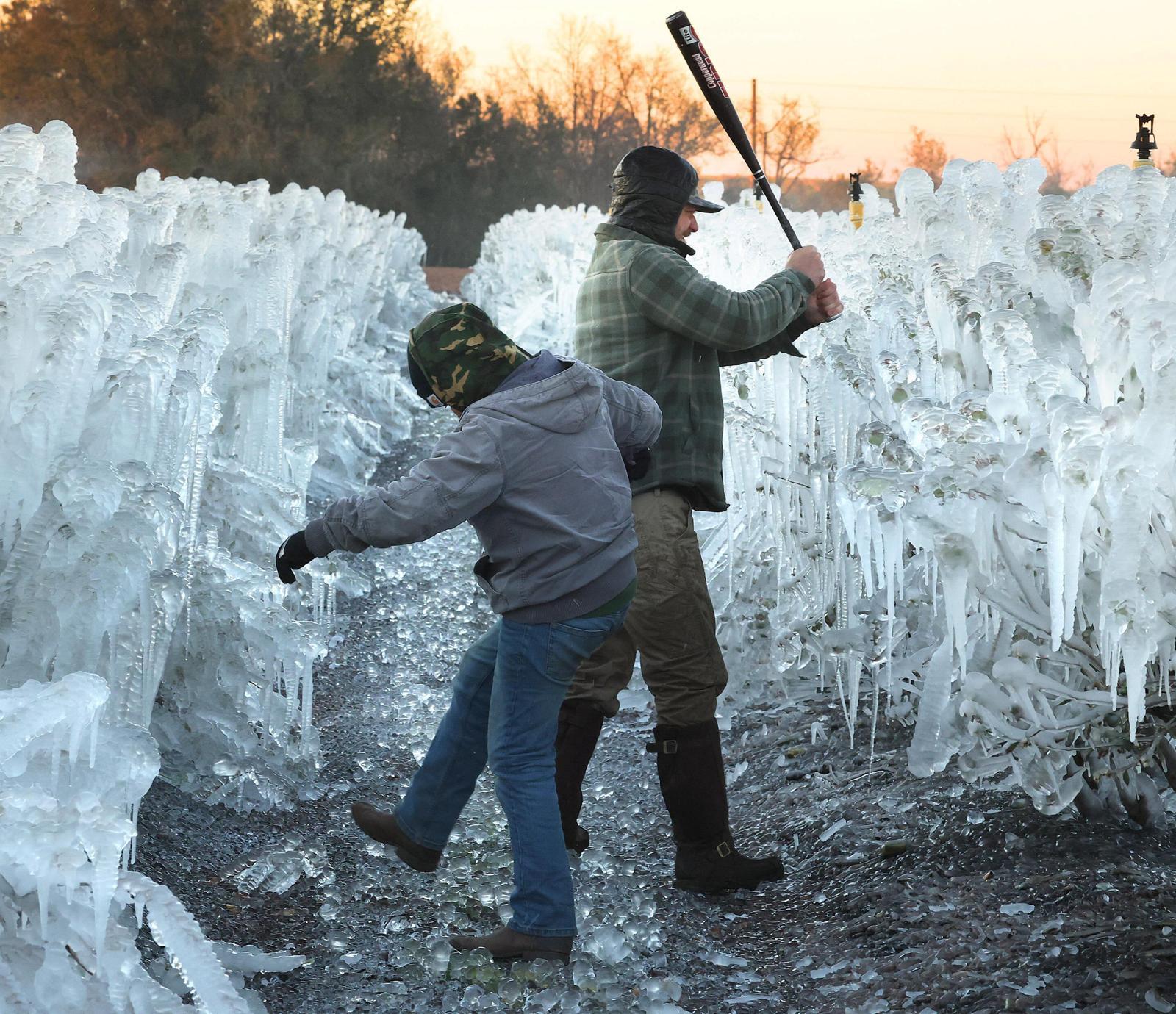 클러몬트의 블루베리 농장에서 농부들이 거대한 얼음층을 야구 방망이와 발로 깨고 있다.