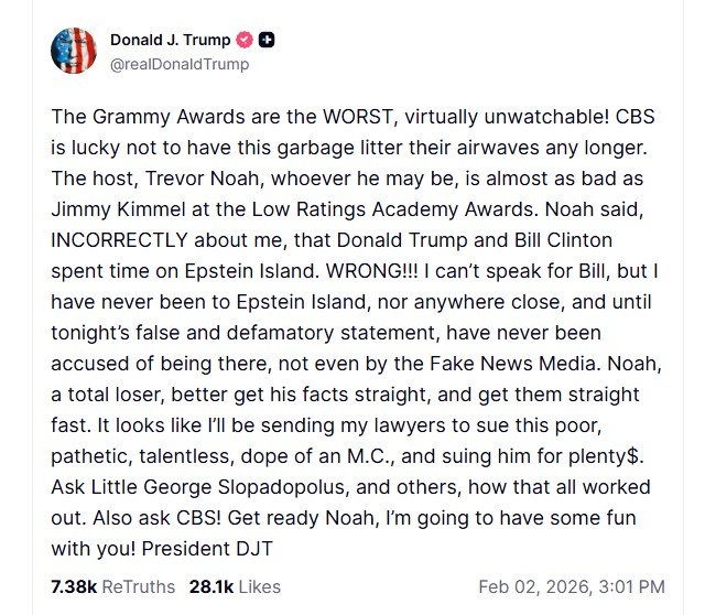 트럼프 대통령은 앞서 자신을 엡스타인과 연관 짓는 농담을 한 그래미 시상식 진행자 트레버 노아에게 소송을 제기하겠다고 위협했다.