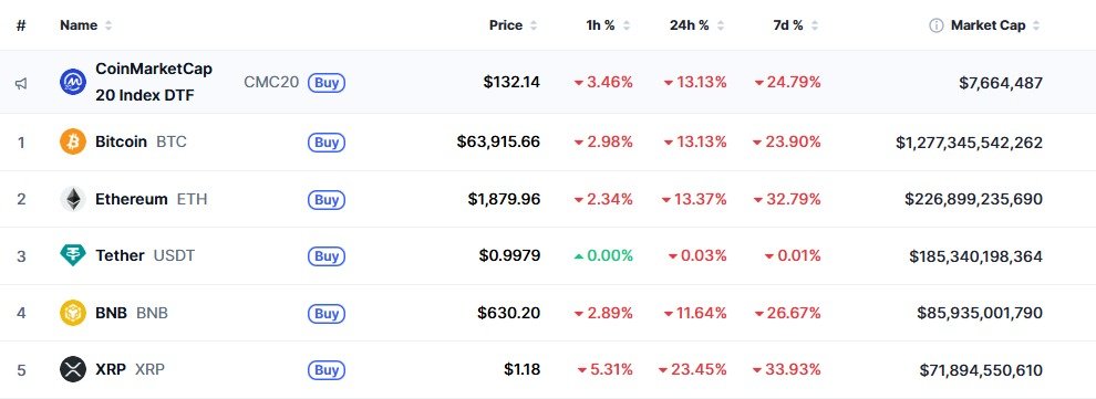 6일 오전 5시 30분 현재 글로벌 코인 시황 중계사이트 코인마켓캡에서 비트코인은 24시간 전보다 13.13% 폭락한 6만3915달러를 기록, 6만4000달러마저 붕괴했다.