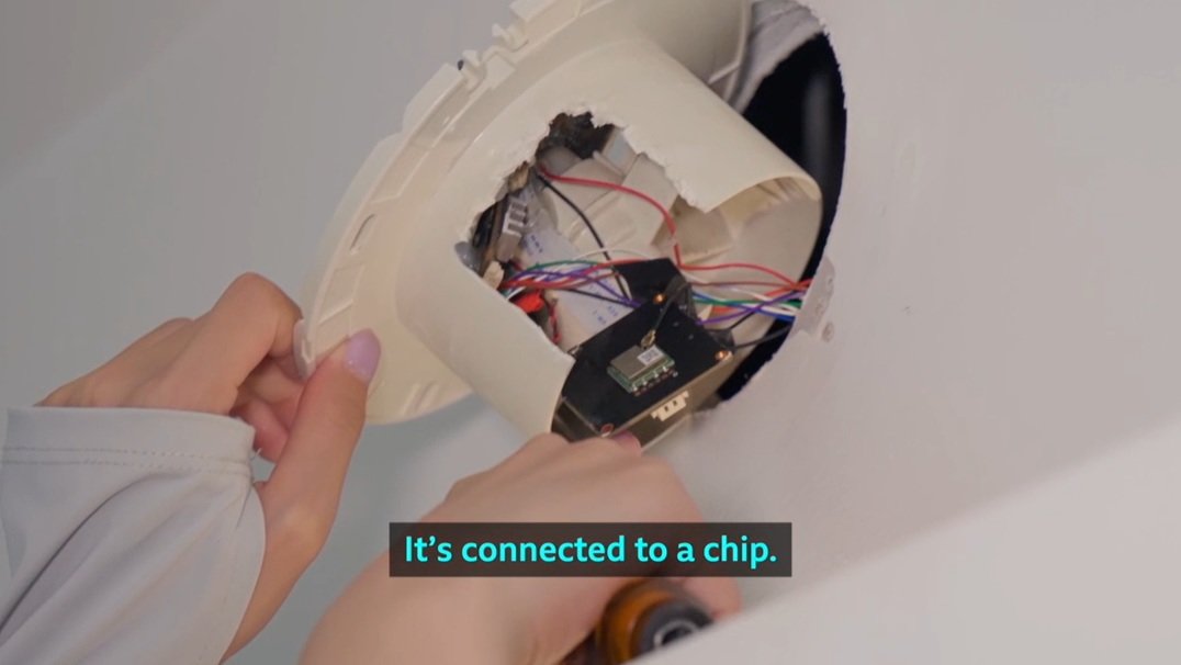 중국 호텔 객실 내 설치된 몰래카메라를 BBC 취재진이 확인하는 모습. BBC캡처한 생중계 웹사이트는 월 450위안(약 9만5000원)의 이용료로 여러 객실을 생중계했다. 영상은 되감기나 내려받기까지 가능했다. BBC는 “통상적인 객실 점유율을 기준으로 추산하면 그간 수천 명의 투숙객이 촬영됐을 가능성이 있다“며 ”대부분은 자신이 카메라에 찍혔다는 사실조차 모를 것“이라고 밝혔다.