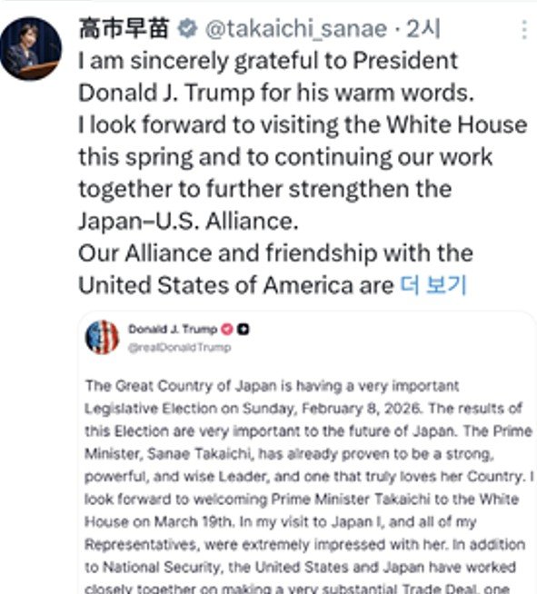 트럼프 “다카이치 압승 축하…‘힘을 통한 평화’ 성공 거두길”