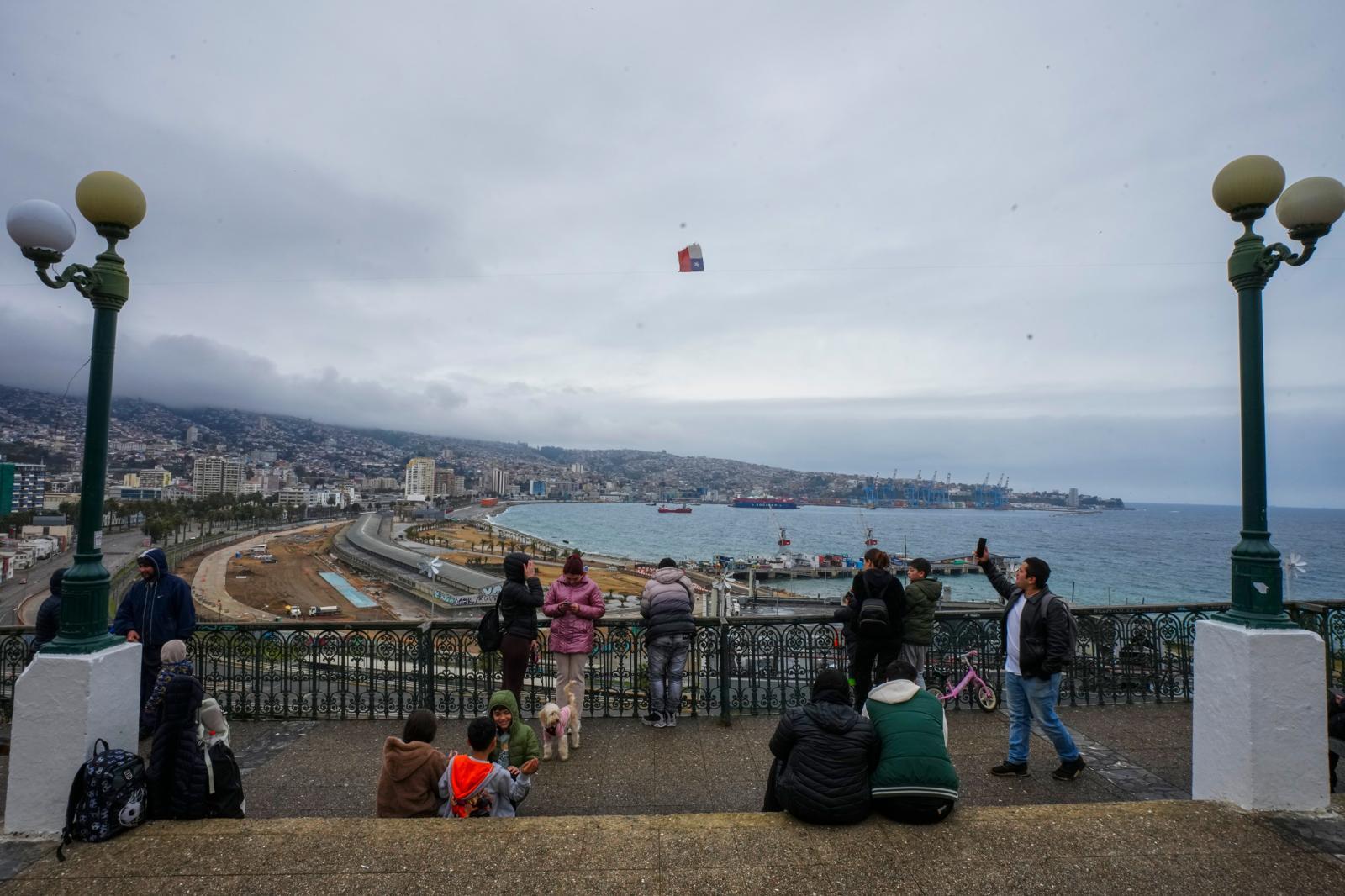 2025년 7월 30일 러시아 캄차카반도에서 발생한 지진으로 예방 차원의 쓰나미 경보가 발령된 칠레 발파라이소에서 바론 전망대에 모인 사람들이 바다를 바라보고 있다. 2026.02.09 발파라이소=AP 뉴시스