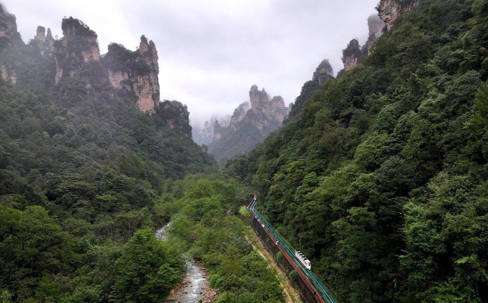 지난해 10월 19일 중국 후난성 장자제에서 관광 트램을 타고 장자제 국립공원을 방문하는 관광객들을 드론으로 촬영한 모습. 베이징=신화/뉴시스