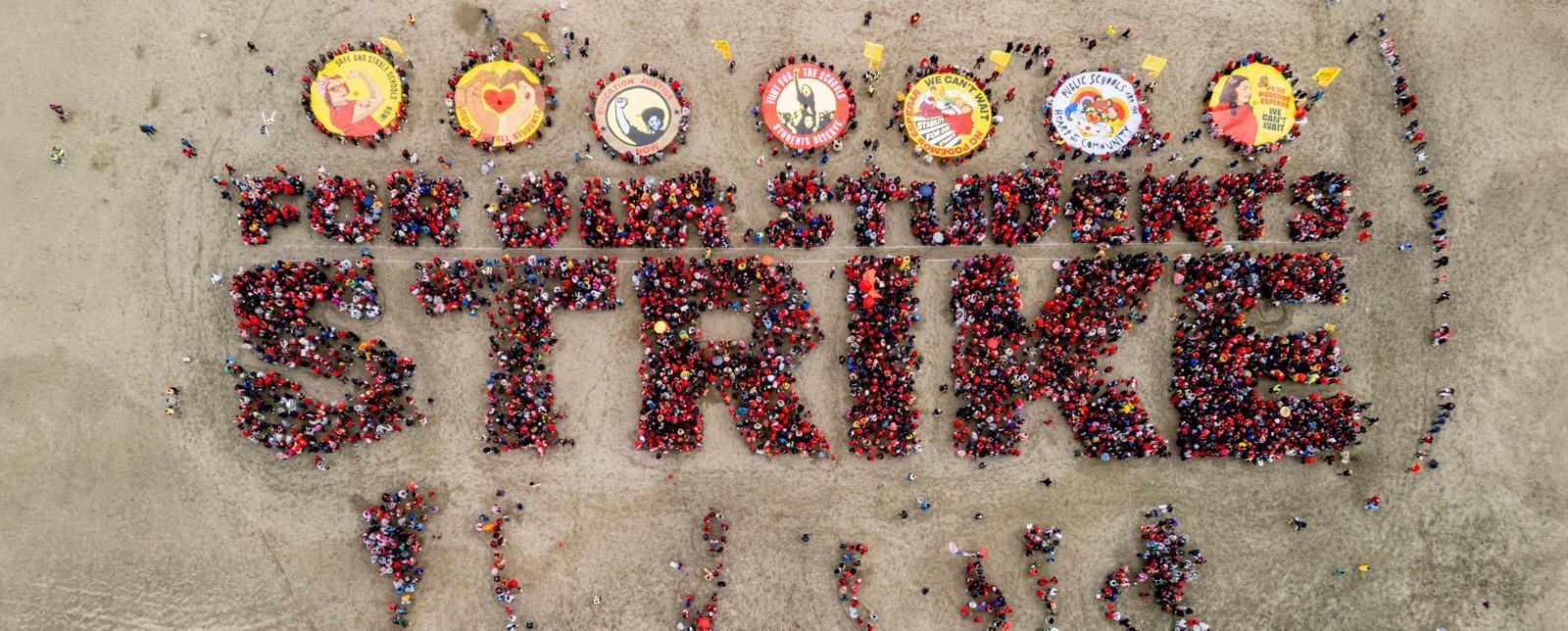11일 미국 캘리포니아주 샌프란시스코 오션비치에 사람들이 모여 ‘FOR OUR STUDENTS STRIKE(학생들을 위해 파업한다)’란 문구를 만들고 있다. 샌프란시스코 공립교사 약 6000명은 9일부터 임금 인상과 특수교육 인력 확충 등을 요구하며 45년 만에 전면 파업에 돌입했다.