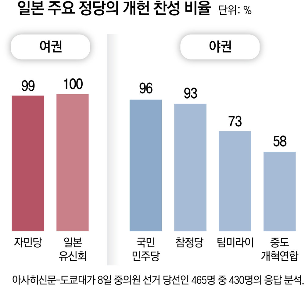 아사히신문은 도쿄대와 함께 이번 중의원 당선자 465명 중 430명으로부터 개헌 설문을 진행한 결과 전체 응답자의 93%가 개헌에 찬성했다고 12일 전했다. 개헌 찬성파가 90%를 넘은 것은 2003년부터 중의원 및 참의원(상원) 당선자들에게 개헌 조사를 실시한 이래 처음이다. 이전까지 중의원 당선자들의 개헌 찬성률은 제2차 아베 신조(安倍晋三) 정권이 출범한 2012년(89%)이 가장 높았다. 이번엔 아베 전 총리가 개헌을 추진한 당시보다 찬성률이 4%포인트 높아진 것이다.