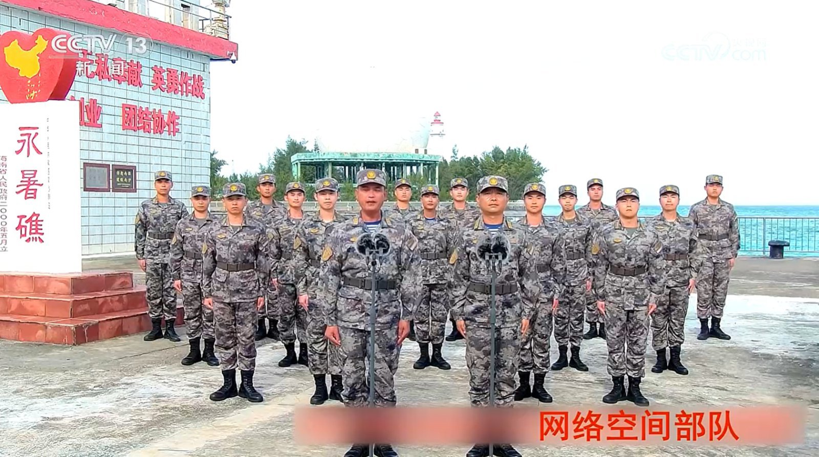 해당 영상에는 중국군 사이버공간부대가 피어리 크로스 암초에 주둔해있는 점을 나타내는 부분이 눈에 띈다. 장병들이 도열한 배경에는 바다가 펼쳐져 있고 옆에 있는 건물에는 ‘융수자오(永暑礁)’라는 중국식 지명이 새겨진 모습이 보인다.