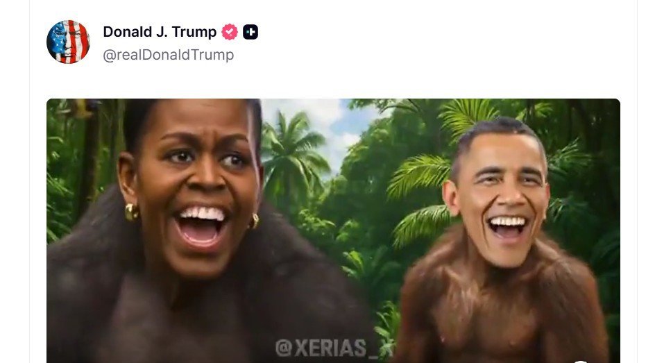 도널드 트럼프 미국 대통령이 5일(현지 시간) 소셜네트워크서비스(SNS) 트루스소셜에 버락 오바마 전 대통령 부부 얼굴을 원숭이에 합성한 영상을 공유했다가 논란이 일자 삭제했다. 트루스소셜 캡처