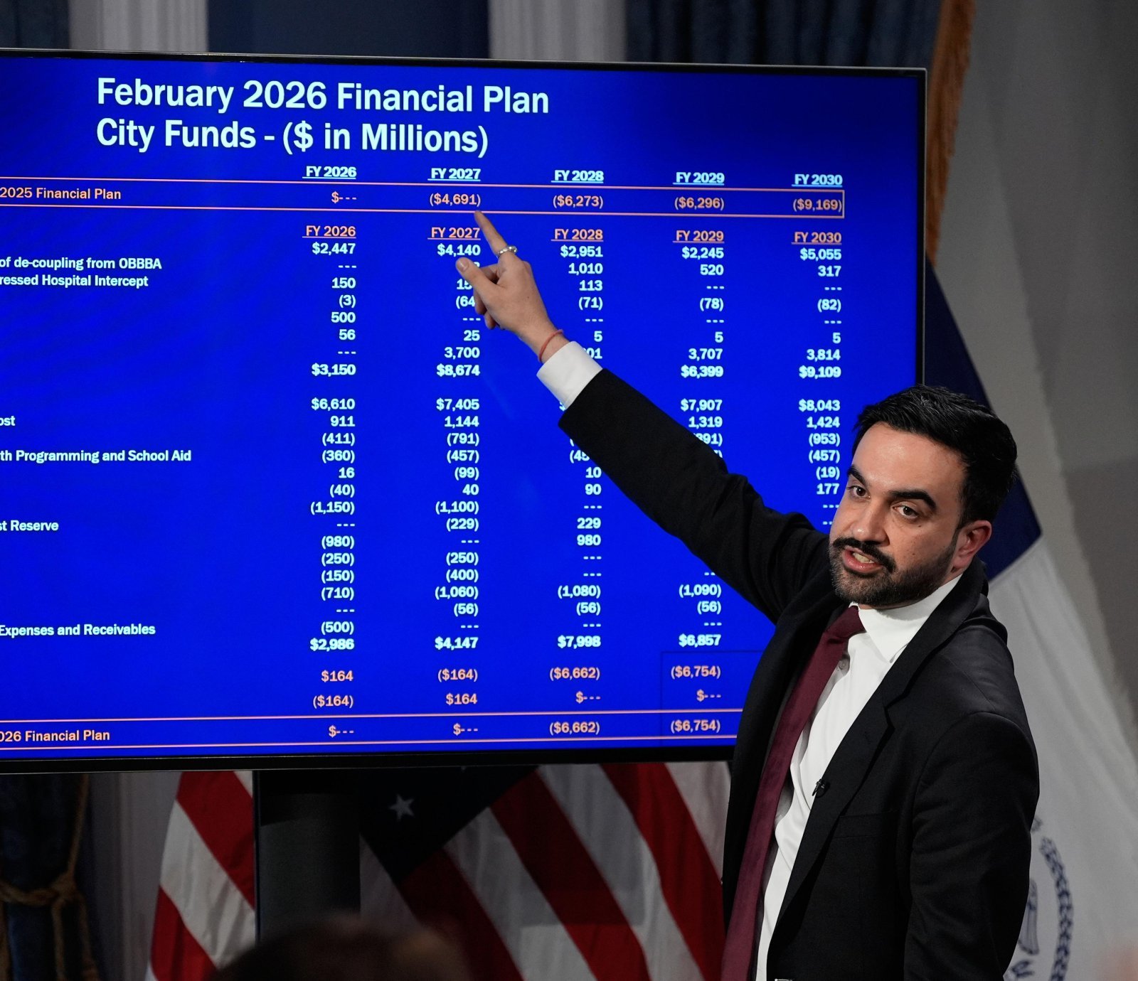 조란 맘다니 미국 뉴욕시장이 17일 뉴욕에서 열린 기자회견에서 재산세 9.5% 인상을 담은 예산안을 발표하고 있다. 뉴욕=AP 뉴시스