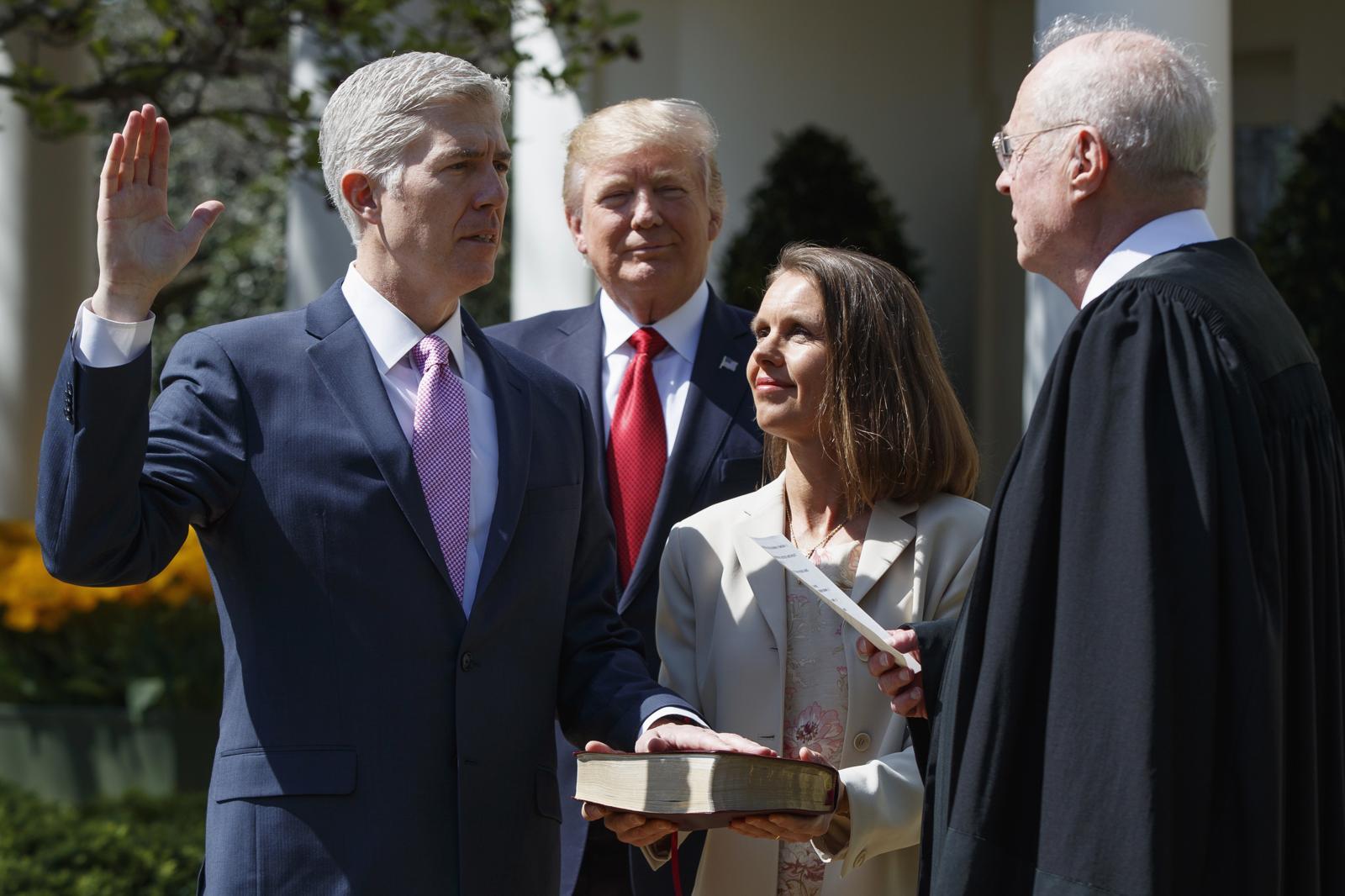 도널드 트럼프 미국 대통령이 자신의 관세 정책을 위법으로 판단한 연방대법원 판결과 관련해 보수 성향 대법관 3명을 공개적으로 비판했다. 사진은 고서치 대법관이 2017년 4월 백악관 로즈가든에서 당시 앤서니 케네디 대법관에게 취임선서를 하는 모습. 2026.02.21 【워싱턴=AP/뉴시스】