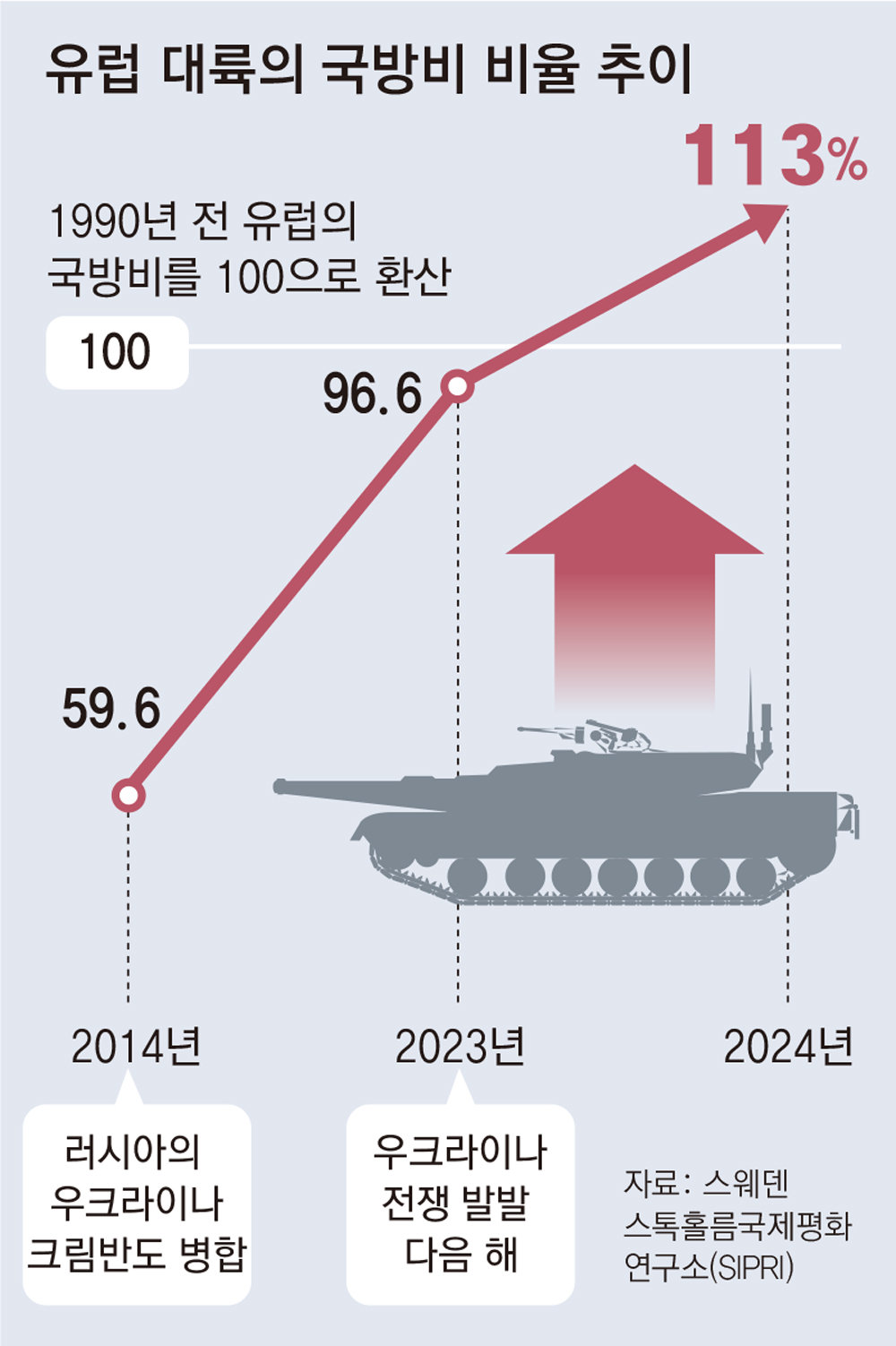 냉전 해제 후 유럽의 국방비는 러시아가 우크라이나 남부 크림반도를 강제 병합한 2014년에 1990년의 59.6%(3670억 달러·약 531조 원) 수준까지 떨어졌다. 2022년 2월 우크라이나 전쟁이 발발한 후 5920억 달러(약 857조 원)로 급증했고 2024년에는 10년 전보다 2배 가까이 늘어난 것이다.
