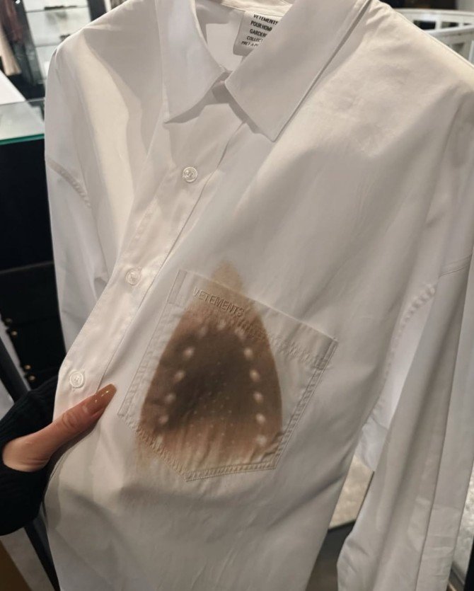 이 셔츠는 다림질을 오래 올려놓았을 때 생기는 그을린 흔적을 사실적으로 표현한 것이 특징이다. 어둡게 번진 자국과 손상된 듯한 질감을 의도적으로 구현해 마치 옷이 망가진 것처럼 보이도록 디자인됐다.