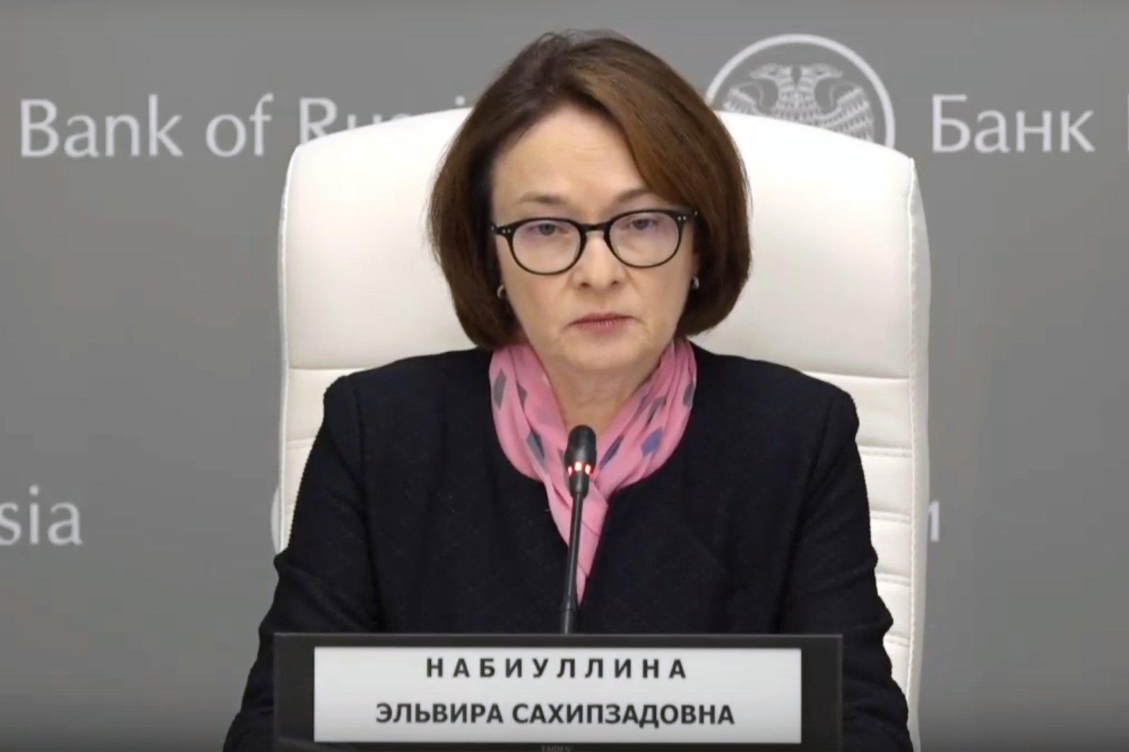 엘비라 나비울리나 러시아 중앙은행 총재가 지난해 10월24일(현지 시간) 모스크바에서 열린 이사회 회의 후 기자회견에서 “당분간 긴축적인 통화정책을 유지할 것”이라고 밝혔다. 러시아 경제가 전쟁 4년 차에 하강 국면에 접어들었다. 2026.2.25.[모스크바=AP/뉴시스]