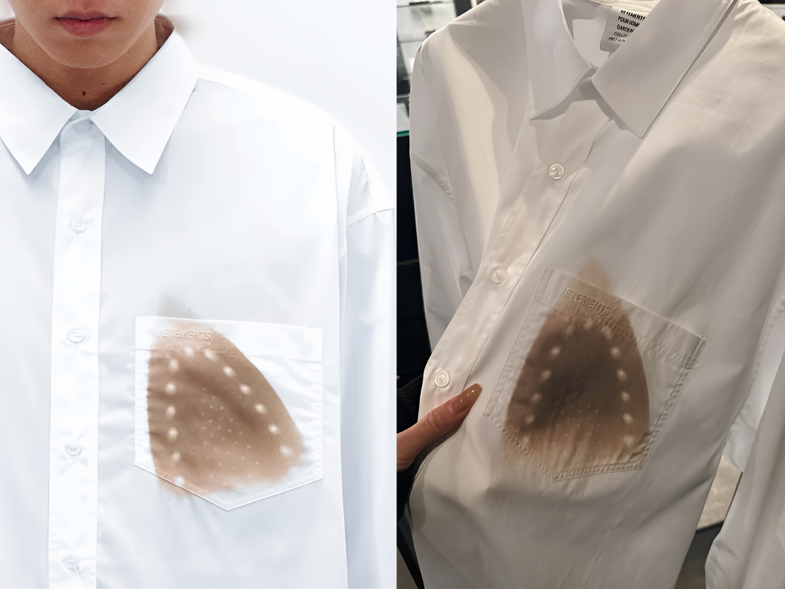 프랑스 패션 브랜드 베트멍(Vetements)이 다림질 하다가 옷을 태웠을 때 남은 자국을 디자인으로 활용해 눈길을 끌고 있다. 가사 실수를 창의적인 그래픽으로 승화한 이 제품은 고가임에도 일부 매장에서 품절되는 등 뜨거운 반응을 얻고 있다.