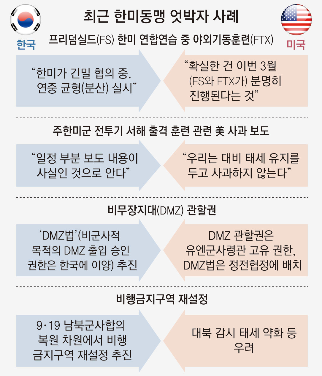 또 정부가 9·19 남북 군사합의 복원을 위해 비행금지구역을 재설정하는 것에 대해서도 미국은 대북 감시 태세 약화 등을 우려해 이견을 보이는 것으로 알려졌다. 군 관계자는 “DMZ법과 연합훈련, 미중 전투기 대치 상황 등에서 한국이 동맹(미국)보다 북한과 중국을 더 신경 쓰는 듯한 모습을 보이는 것은 바람직하지 않다”고 했다.