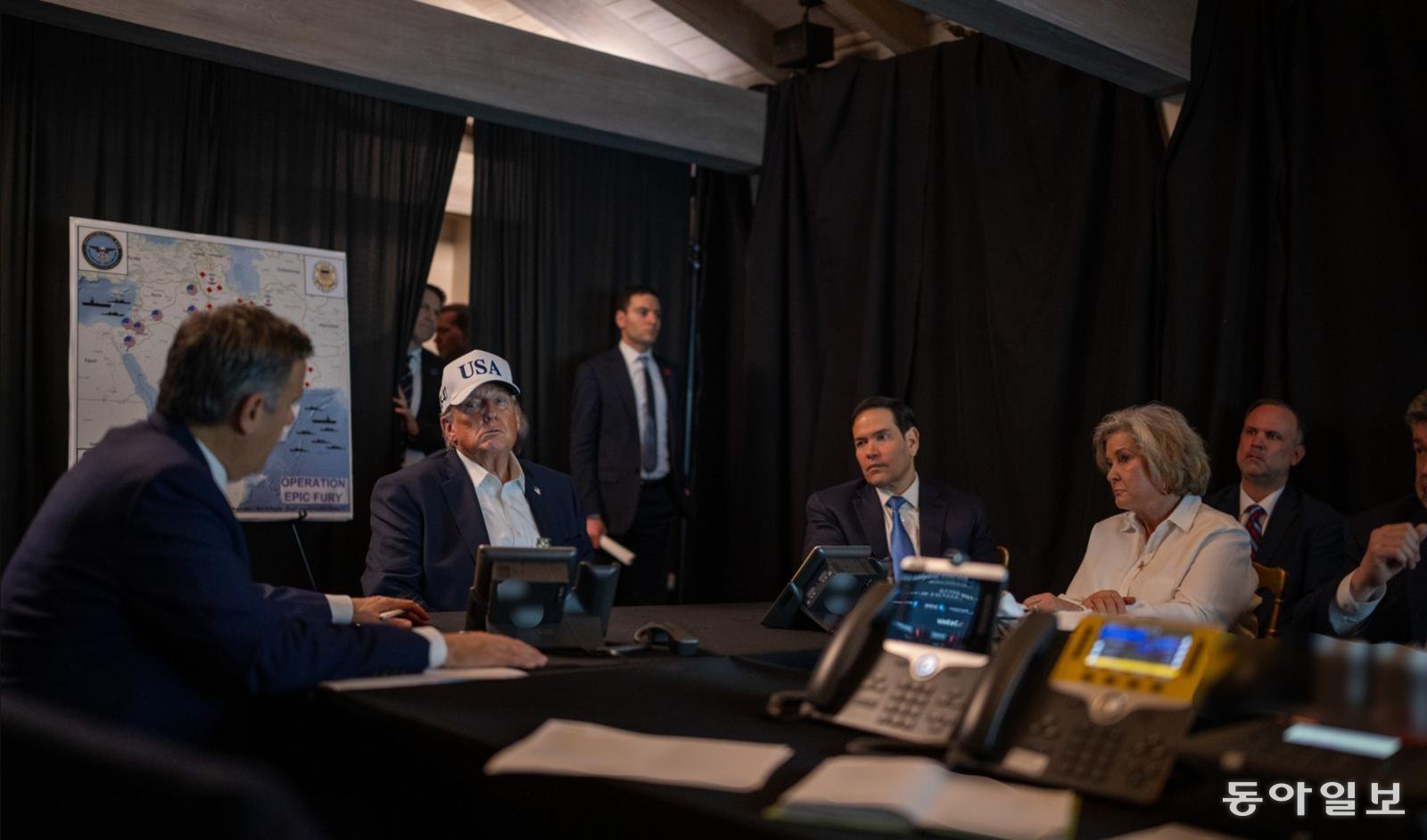 공개된 사진을 살펴보면 트럼프 대통령은 어두운 실내에서 ‘미국(USA)’라고 써진 흰색 모자를 쓰고 가운데에 앉아있다. 그의 옆에는 루비오 장관과 와일스 비서실장 등이 앉아있고, 그의 뒤에는 ‘장대한 분노’라고 작전명이 쓰여 있는 지도가 펼쳐져 있다.