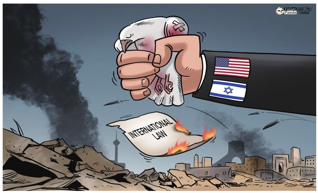 같은 날 글로벌타임스는 만평을 게재하고 미국과 이스라엘을 평화의 파괴자로 비판했다. 만평은 미국과 이스라엘이 비둘기를 손아귀에 쥐고 국제법을 불태우는 장면을 그렸다.