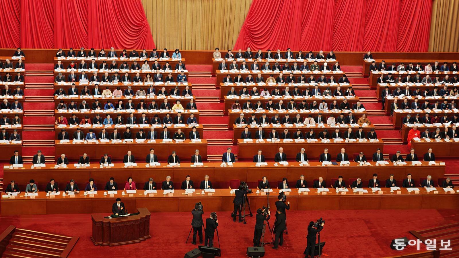 4일 정협 개막식에서 연단 둘째 줄에 시진핑 중국 국가주석을 비롯해 정치국원 20명이 앉아있다. 발표자로 나온 왕후닝 정협 주석을 포함하면 정치국원 23명 중 21명만이 참석했다. 베이징=김철중 특파원 tnf@donga.com