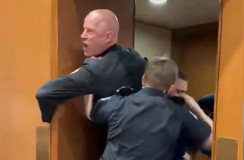 이후 맥기니스 후보가 고성을 지르며 공습에 항의하는 발언을 이어가자 의회 경관들이 그를 밖으로 끌어내기 시작했다. 맥기니스 후보가 문틀을 움켜잡고 버티자, 시히 의원이 달려가 맥기니스의 팔을 잡고 끌어내려 했다. 이 과정에서 맥기니스의 팔이 문 사이에 껴서 부러진 것으로 알려졌다.