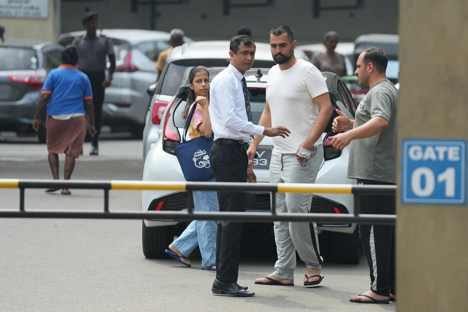 [갈레=AP/뉴시스] 스리랑카 남쪽 해역에서 침몰된 이란 해군 호위함 ‘아이리스 데나’에서 구조된 승조원 2명이 5일(현지 시간) 갈레에 있는 국립병원 입구에서 보안 요원과 얘기를 나누고 있다. 미국은 “‘아이리스 데나’호는 미군 잠수함의 어뢰 공격으로 침몰한 것”이라고 밝혔다. 침몰 당시 이 호위함에는 승조원 180명이 타고 있었으며 32명이 구조되고 시신 87구가 수습돼 사망자 숫자는 더 늘어날 것으로 보인다.