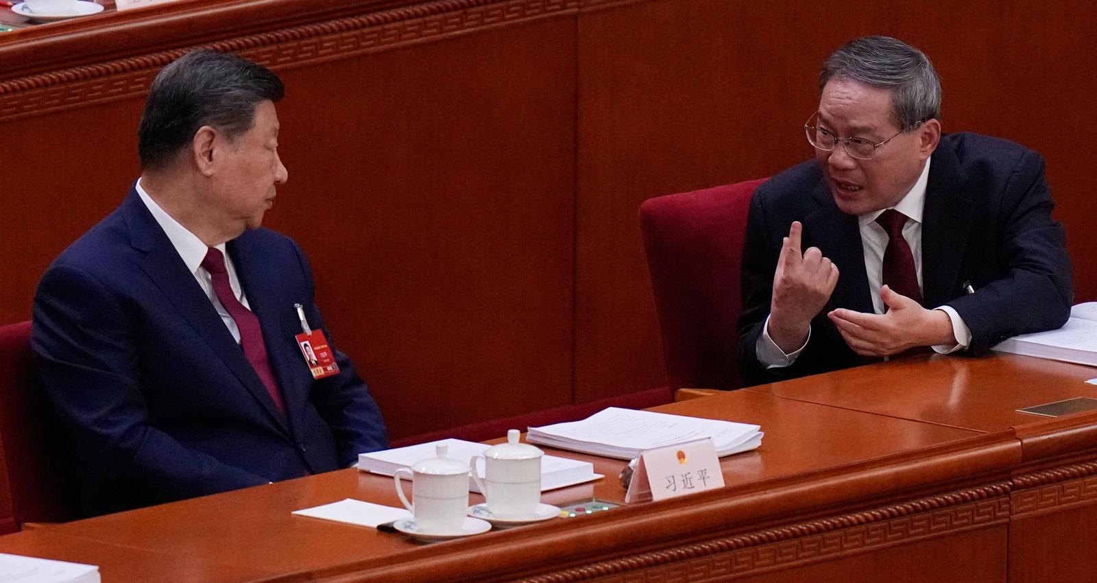 5일 중국 베이징에서 열린 전국인민대표대회(전국인대) 개막식에서 시진핑 국가주석(왼쪽)이 리창 총리(오른쪽)와 이야기를 나누고 있다. 이날 중국은 올해 경제성장률 목표치를 4.5∼5.0%로 제시했다. 베이징=AP 뉴시스