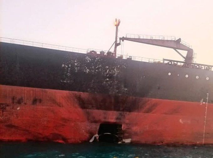 이란 드론 공격에 구멍 뚫린 美유조선