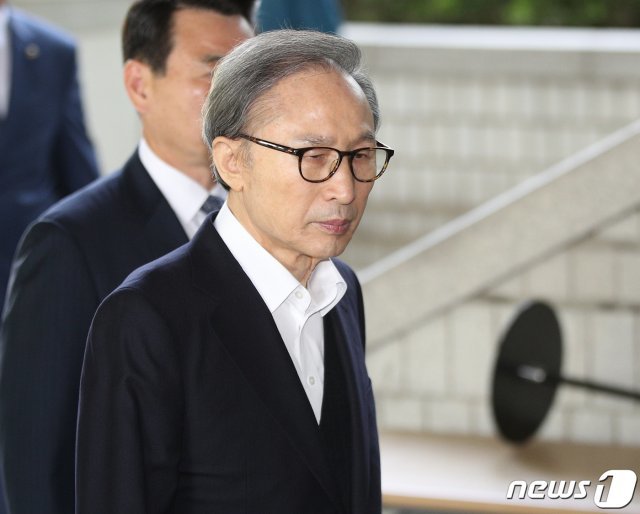 이명박 전 대통령이 8일 오전 서울 서초구 서울고등법원에서 열린 항소심 공판기일에 출석하고 있다. 2019.5.8/뉴스1 © News1