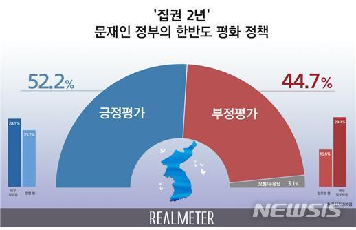 여론조사 기관 리얼미터는 오마이뉴스 의뢰로 지난 2년 동안 문재인 정부 한반도 평화 정책에 대한 여론조사를 실시한 결과 ‘잘했다’는 긍정평가가 52.2%(매우 잘했음 28.5%, 잘한 편 23.7%)%로 조사됐다고 8일 밝혔다.
