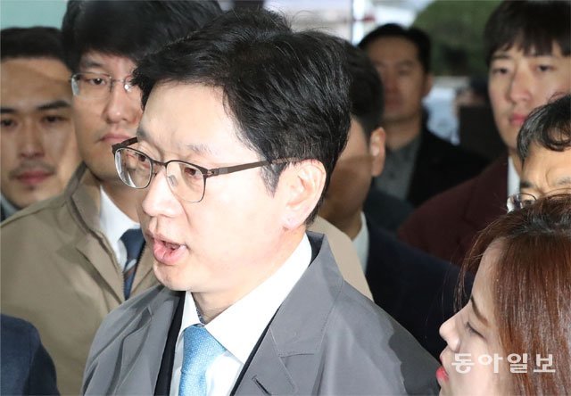 ‘드루킹’ 일당과 공모해 댓글 여론 조작을 벌인 혐의로 기소된 김경수 경남도지사가 29일 서울 서초구 서울중앙지법에서 열린 첫 재판에 출석하며 기자들의 질문에 답하고 있다. 김재명 기자 base@donga.com