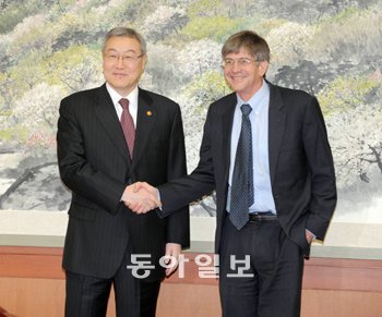김성환 외교통상부 장관(왼쪽)과 제임스 스타인버그 미국 국무부 부장관(오른쪽)이 26일 서울 종로구 정부중앙청사 별관에서 면담을 시작하면서 악수하고 있다. 양회성 기자 yohan@donga.com