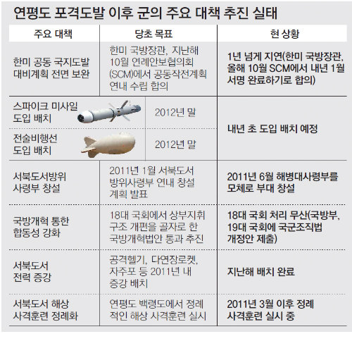 전력 증강 계획도 차질을 빚고 있다. 군 당국은 연평도 도발 직후 북한의 해안포를 정밀 타격할 수 있는 스파이크 미사일을 이른 시기에 도입해 연평도와 백령도에 배치한다고 밝혔지만 2년 가까이 실현되지 않고 있다. 군 당국은 당초 올해 말까지 도입할 계획이었지만 예산과 성능 점검 문제로 내년 초에나 가능할 것으로 보인다.