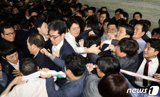 한국당 의원들은 “헌법수호” “독재타도”를 외치며 민주당 의원들과 몸싸움을 벌였으며, 이에 민주당 의원들은 “사람이 다친다” “이성적으로 풀자”며 반발했다.