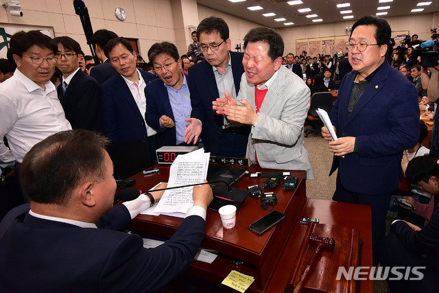30여 분간 실랑이가 계속되자 이 위원장은 결국 오후 11시46분께 안건을 무기명 투표에 부쳤고, 표결은 5분 만에 종료됐다. 한국당은 산회한 뒤에도 회의 결과에 대해 “원천 무효”라며 반발을 멈추지 않았다.