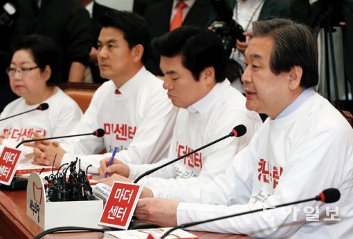새누리당 김무성 대표(오른쪽)가 3월 21일 국회에서 열린 최고위원회의에 참석해 모두발언을 하고 있다. 동아일보