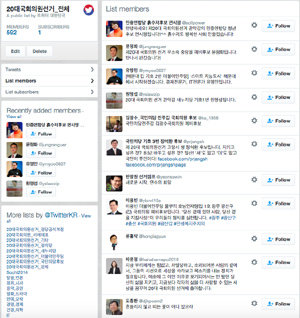 트위터 코리아는 후보자들의 계정을 한 눈에 볼 수 있도록 ‘전체 후보자 리스트(twitter.com/TwitterKR/lists/20/members)’를 비롯해 ‘정당별 후보자 리스트’, ‘비례대표 리스트’ 등을 제공하고 있다. 이를 통해 각 후보자들이 올리는 트윗을 실시간 확인할 수 있다.