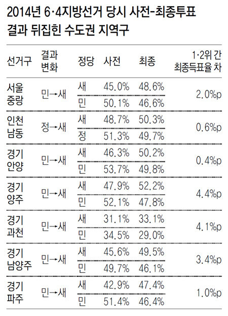2014년 6·4지방선거 당시 사전투표 결과 10곳 중 9곳에서 최종 투표와 일치했지만 나머지 지역에선 ‘극적인 뒤집기’도 이뤄졌다.