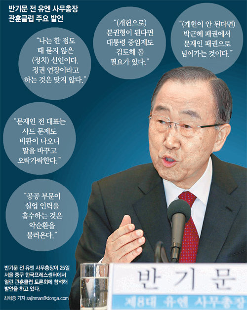 반기문 전 유엔 사무총장이 25일 더불어민주당 문재인 전 대표가 집권하면 “‘박근혜 패권’에서 ‘문재인 패권’으로 넘어가는 것”이라며 문 전 대표를 직접 겨냥해 비판했다. 또 조기 개헌에 반대하는 문 전 대표를 겨냥해 ‘대선 전 개헌’을 통한 정치교체 의지를 밝혔다. 개헌을 고리로 세력을 규합해 주춤한 지지율을 끌어올리는 등 위기를 돌파하겠다는 전략으로 보인다.