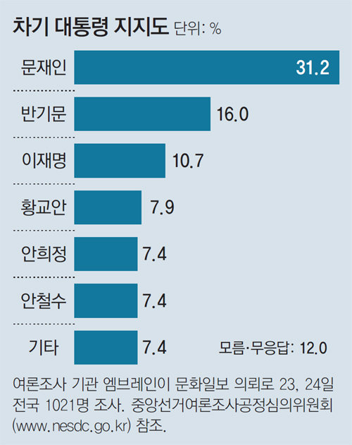 하지만 지지율이 하락 추세를 보이고 있는데도 반 전 총장이 거취와 정책 비전에 대해 구체적인 구상을 내놓지 않으면서 여권에서는 적지 않은 우려의 목소리가 나온다. 여론조사기관 엠브레인이 문화일보 의뢰로 조사한 대선주자 지지율에서 반 전 총장은 16.0%로 문 전 대표(31.2%)의 절반 수준이었다. 가상 양자 대결 조사에서도 문 전 대표, 안희정 충남도지사, 이재명 성남시장 등 민주당 주요 대선주자에게 모두 지는 것으로 나타났다.