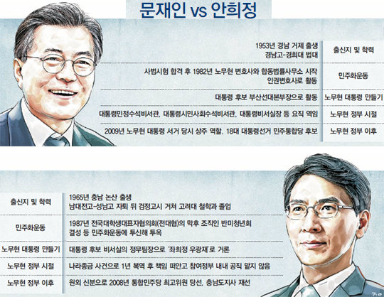 ‘노무현의 친구’ 문 전 대표와 ‘노무현의 적자’ 안 지사는 이제 민주당 대선 후보 자리를 놓고 격돌하고 있다. 최근 대선 행보에서 다른 목소리를 내는 만큼이나 두 사람은 정치적 뿌리와 삶의 궤적, 정치 목표에서도 차이가 있다.