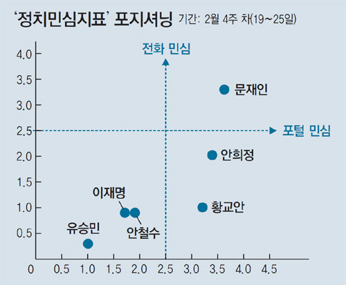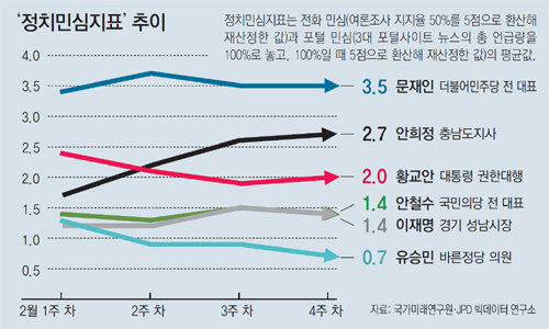 문 전 대표는 전화, 포털 민심 모두 굳건한 1위를 유지했다. 문제는 2월 내내 제자리걸음(3.4→3.7→3.5→3.5)을 했다는 점. 문 전 대표는 지난달 김대중, 노무현 정부 장차관들의 지원 모임인 ‘10년의 힘 위원회’를 띄우는 등 ‘세몰이’를 하고 있지만 민심의 흐름은 정체 상태인 셈이다.