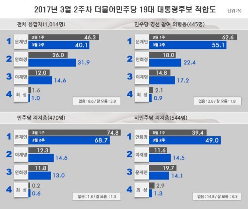 민주당 대통령후보 경선에 선거인단으로 등록할 의향이 있다고 응답한 경선 참여 의향 층에서는 문재인 전 대표가 3월 1주차 조사 대비 7.5%p 하락한 55.1%의 적합도를 기록, 4.4%p 상승한 2위 안희정 지사(22.4%)와의 격차가 1주일 전 44.6%p에서 32.7%p로 좁혀졌고, 이재명 시장은 2.4%p 상승한 17.2%, 최성 시장은 1.2%p 하락한 0.9%로 집계됐다.