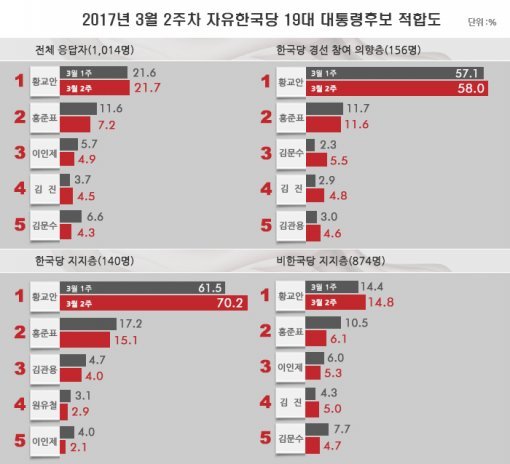 한국당 지지층에서는 황교안 권한대행이 70.2%로, 2위 홍준표 지사(15.1%)를 55.1%p 앞섰고, 이어 김관용 지사(4.0%), 원유철 전 원내대표(2.9%), 이인제 전 최고위원(2.1%), 김문수 전 경기지사(1.7%) 순으로 나타났다. 민주당·국민의당·바른정당 등 비한국당 지지층에서는 황교안 권한대행이 14.8%, 홍준표 지사가 6.1%, 이인제 전 최고위원이 5.3%, 김진 전 중앙일보 논설위원이 5.0%, 김문수 전 지사가 4.7%순으로 집계됐다.
