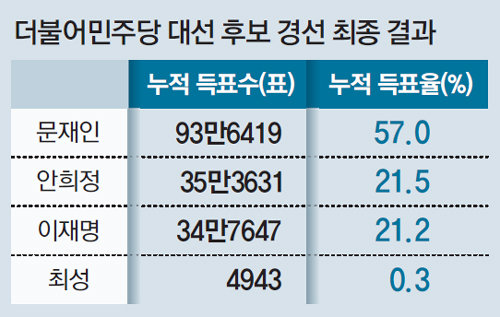 하지만 문 전 대표는 두 팔을 하늘로 번쩍 들었던 이전 경선과 달리 이날은 팔을 들지 않고 몸을 낮추며 경쟁 주자들을 배려했다. 대선 후보로 확정된 순간 문 전 대표는 안 지사, 이재명 경기 성남시장, 최성 경기 고양시장의 손을 일일이 두 손으로 맞잡았다.