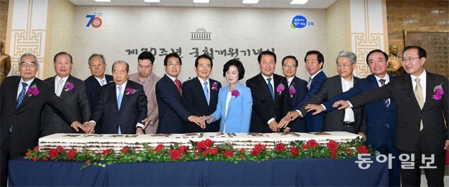 국회 개원 70돌 29일 국회에서 열린 제70주년 국회개원 기념행사에서 정세균 국회의장(왼쪽에서 일곱 번째)과 심재철 국회부의장(왼쪽에서 여섯 번째), 여야 지도부 등이 기념 떡을 자르고 있다. 김동주 기자 zoo@donga.com