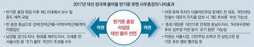 다만 반 총장의 대선행이 새누리당에 ‘축복’일지는 장담할 수 없다. 여권에선 반 총장이 계파 갈등에 찌든 새누리당 대신 ‘제3 지대’에서 보수 및 중도 세력을 모을 수 있다는 전망도 나온다. 그가 방한 중 ‘국민 통합’을 전면에 내세운 것도 의미심장하다. 새누리당 하태경 의원은 이날 의원총회에서 “반 총장에게 ‘몰빵(다걸기)’ 하다가 새누리당으로 오지 않으면 그야말로 ‘불임 정당’이 된다”며 조기 대선 경선을 주장했다.
