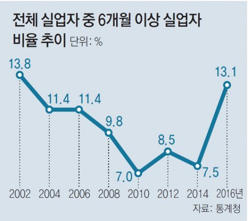 15일 통계청에 따르면 지난해 6개월 이상 실업 상태인 경제활동인구는 13만3000명으로 전체 실업자(101만2000명)의 13.1%로 집계됐다. 이는 2002년(13.8%) 후 가장 높은 수준이다. 이들의 평균 구직 기간은 7.9개월로 조사됐다. 실업자 10명 중 1명꼴로 8개월 가까이 일자리를 구하고 있는 셈이다. 2014년 7.5%였던 장기 실업자 비율은 2년 만에 2배 가까이로 늘었다. 입사원서를 내는 등 구직활동을 해야만 실업자로 분류되기 때문에 실제 장기 실업자는 이보다 훨씬 많을 것으로 추산된다.