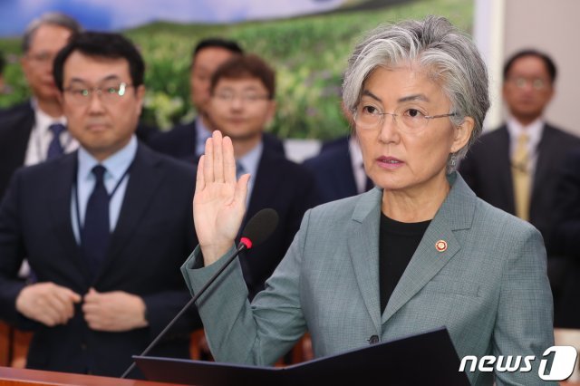 강경화 외교부 장관이 2일 서울 여의도 국회에서 열린 외교통일위원회의 국정감사에서 선서를 하고 있다. 외교부 국감에서는 5일 열리는 북미 실무회담에 대한 집중 질의가 예상된다. 2019.10.2/뉴스1 © News1 이종덕 기자