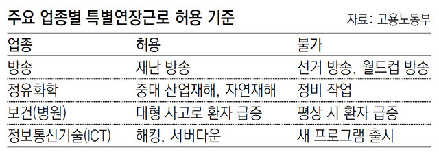 하지만 정유화학업계가 요구한 대(大)정비 기간(일정 기간 공장 가동을 멈추고 실시하는 대대적인 정비작업)이나 방송계가 요청한 선거방송 등은 허용 기준에서 빠졌다. 이를 ‘사회적 재난’으로 볼 수 없다는 이유에서다. 같은 취지로 △ICT 기업의 새 프로그램 출시에 따른 업무 폭증 △병원의 평상 시 환자 급증 등도 허용하지 않기로 했다.