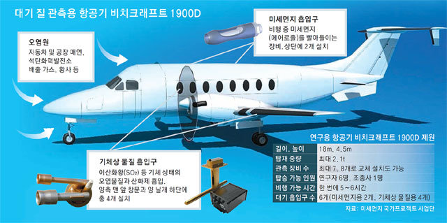 ‘비치크래프트 1900D’는 상공 100∼300m 높이에서 비행 중 대기를 빨아 들여 실시간으로 미세먼지의 이동 경로와 화학적 조성, 크기별 분포를 분석하고 질소산화물(NOx), 황산화물(SOx), 휘발성유기화합물(VOCs) 등 여러 오염물질의 농도를 동시에 관측할 수 있다. 미세먼지 생성 원인과 오염원별 미세먼지 배출량 및 기여도를 밝히는 데 활용 가능하다.